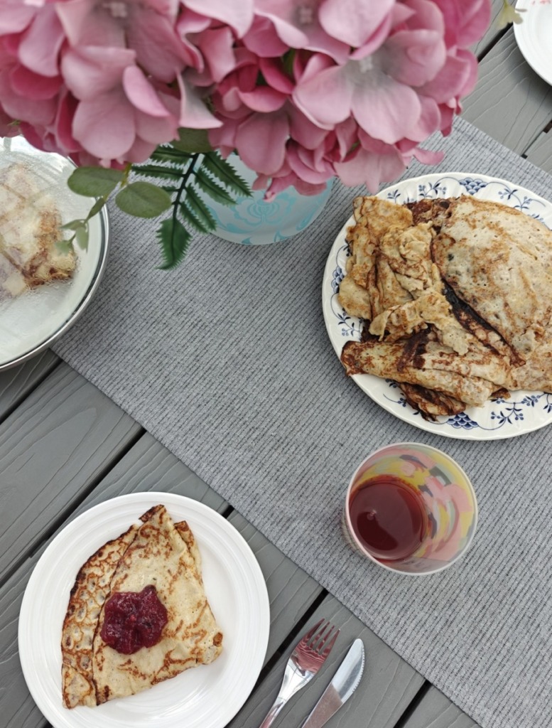 - Ruokailemme usein isolla terassilla, kesäaamuina myös aamupala kannetaan pihalle. Ruoka kokkaillaan joko sisällä tai terassilla grillaillen ja jutellen.